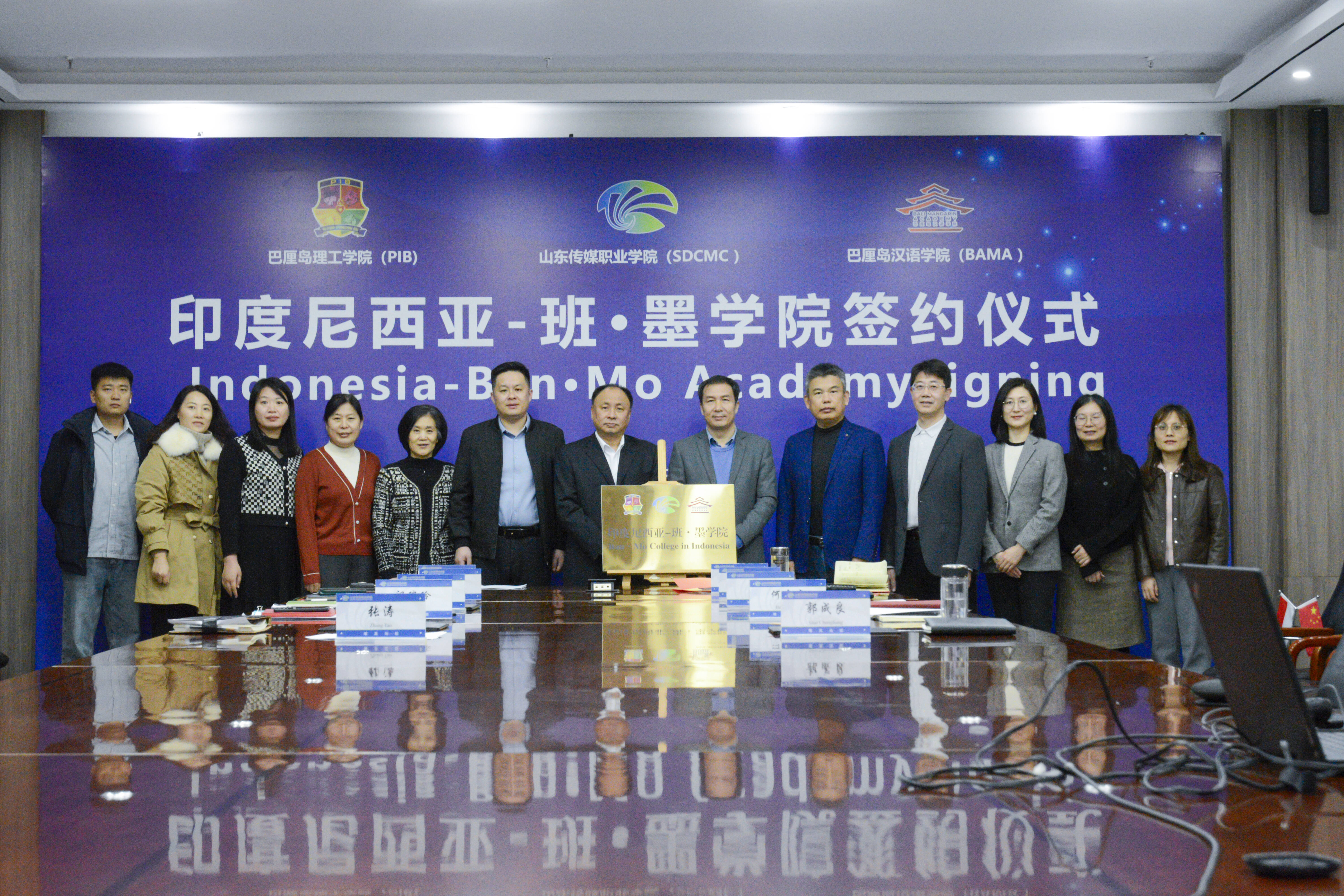 12月23日下午,山东传媒职业学院与印度尼西亚巴厘岛理工学院、巴厘岛汉语学院合作共建“班·墨学院”签约揭牌仪式在行政楼329会议室举行。